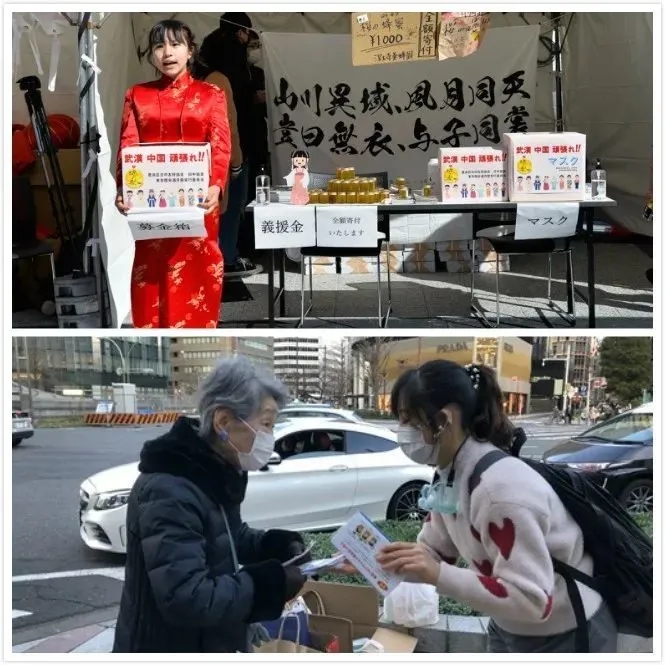 上图是2月8日,在日本东京池袋,日本旗袍女孩为武汉募捐(新华社发);下图是2月20日,在日本名古屋车站附近,在日华侨华人向行人发放口罩(活动举办方供图)。