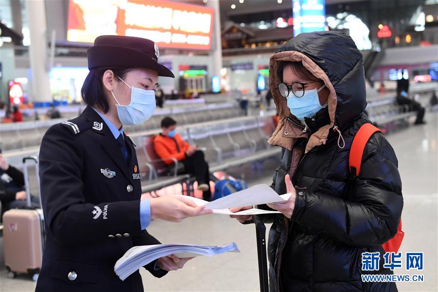 在广西南宁东站,南宁铁路公安处女民警花子惠(左)将自己创作的疫情防控宣传漫画送给乘客(2月4日摄)。新华社记者 陆波岸 摄