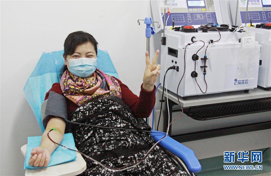 在武汉血液中心的中国医学科学院CPnCoV项目组,康复病人、来自汉口医院的护士蔡桃英在捐献血浆(2月17日摄)。她在2月22日重新返回医院上班。新华社记者 才扬 摄