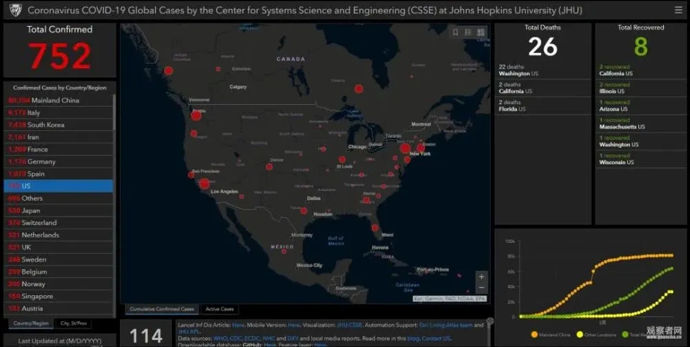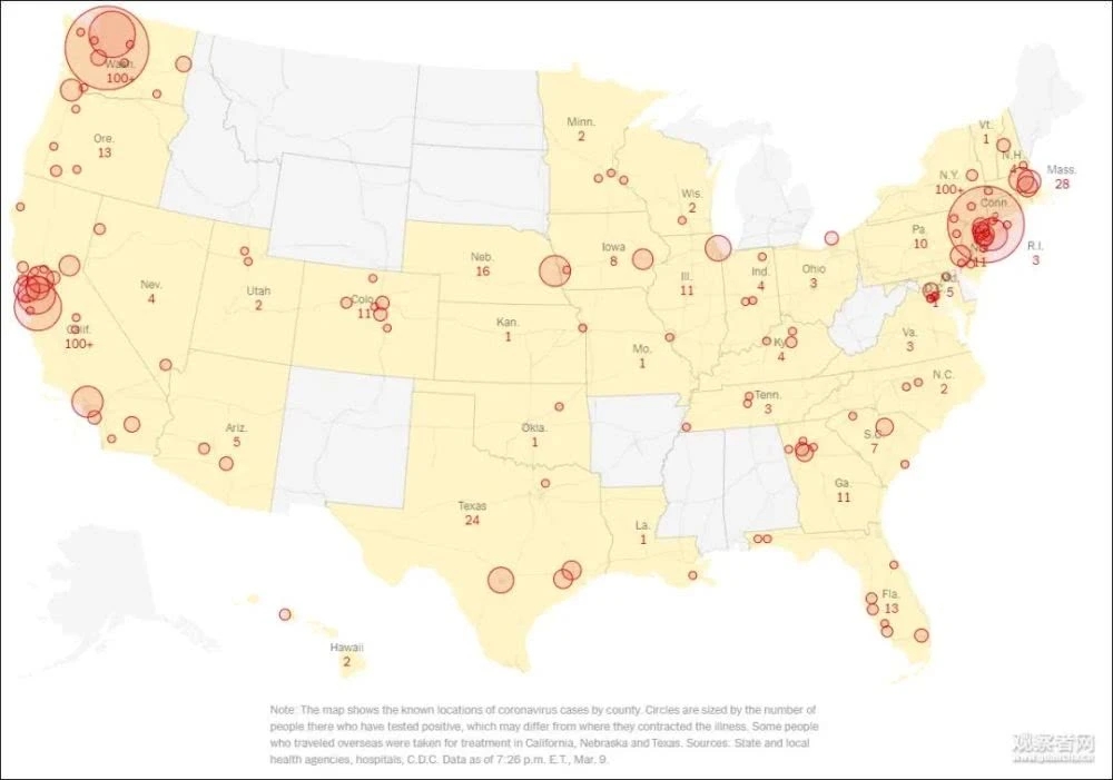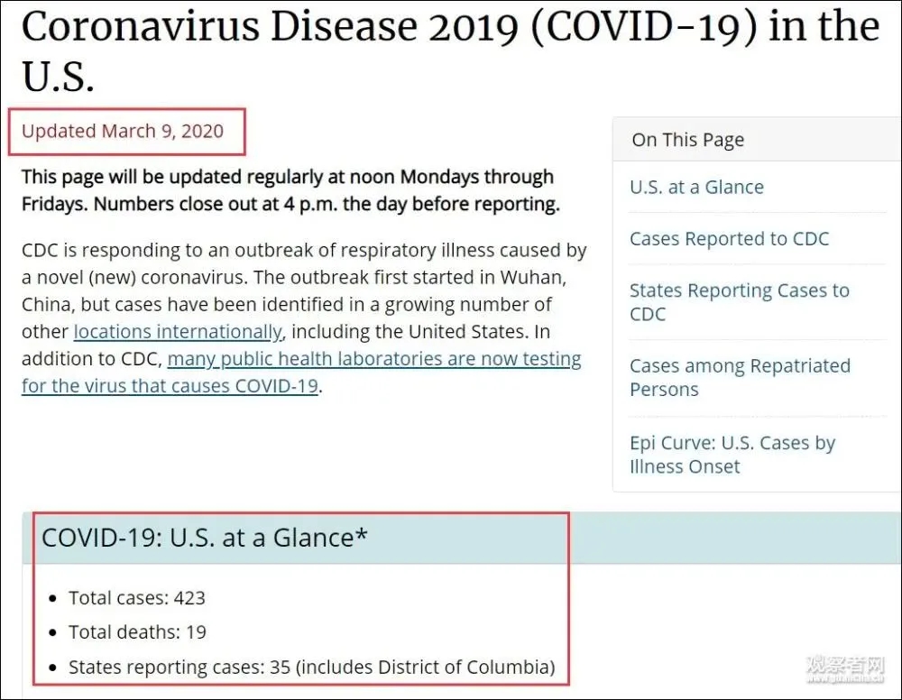 梳理美媒和机构数据后发现,全美目前累计确诊数约在717人至752人之间。 而美国疾控中心并未及时收集地方政府上报的数据。该官网目前显示累计确诊人数仅为423人,大约和美媒3月7日手算数据一致。值得一提,美国疾控中心网站周末不更新数据。 CNN:累计717例确诊 截至北京时间3月10日12点,CNN新闻网统计结果显示,疫情已扩散至全美36州以及华盛顿特区,本土累计确诊人数为647人。此外,自“钻石公主”号豪华邮轮撤侨回国的美国人中,有46人确诊;早前由武汉回美的美国人中有3人确诊;外加停泊旧金山港外“至尊公主”号上确诊21例——全美目前累计确诊717例。 CNN新闻网介绍,717例是通过各地公共卫生系统实时通报数据推算得出,其中含单次核酸检测呈阳性者列为“推定阳性病例(Presumptive Positive)”、以及由美国疾控中心经2次核酸检测结果确诊的“实验室确诊病例(Laboratory confirmed)”。该数据含26例病死病例。 《纽约时报》同样通过叠加全美各地卫生部门数据得知,截至美国当地时间2月10日凌晨,全美累计确诊“至少”728例,其中26人病死。该媒体表示,自1月以来就开始追踪美国确诊病例数,且已经建立数据库,数据来源为联邦政府、州政府以及当地政府官员的数据。 ![]() 纽约时报:累计确诊至少728例 此外,《商业内幕》等在内的很多美国媒体,在报道疫情时引用了美国约翰·霍普金斯大学的疫情数据。后者自1月22日以来,建立新冠肺炎疫情信息中心网站,实时不间断更新全球各地确诊数据。就美国而言,校方曾依靠美国疾控中心数据,但自2月1日起,开始汇总全美各地卫生部门数据,并参考权威媒体报道,手动录入数据。 截至目前,约翰·霍普金斯大学疫情信息中心显示美国累计确诊已达752例,含26例病死病例,出院8例。 ![]() 约翰·霍普金斯大学:累计确诊752例 对于累计确诊排名靠前的国家,约翰·霍普金斯大学均采用当地卫生部门提供的数据,譬如中国卫健委3月10日公布的80754例累计确诊、意大利卫生部官网3月9日给出的9172例、以及韩国疾控中心于3月10日上午9点更新的7513例。但对于美国疫情收据采集,该校并没有参考美国疾控中心官网数据。 ![]() 美国疾控中心官网至今显示全美累计确诊仅为423例,标注为“3月9日”更新。而CNN新闻网早于3月7日汇总得知,全美当时已有437例确诊病例。 ![]() 作为另一个和本次疫情防控息息相关的部门,美国卫生与公共服务部官网无该机构自行统计数据,仅是给出一个美国疾控中心的链接。而需要注意的是,美国疾控中心官网并非每天更新数据。该部门称,仅会在周一至周五每天的中午更新数据——周末不更新数据。 美国官方不仅延迟公布确诊人数,还隐瞒关键数据。自3月2日起,美国疾控中心以“数据不准”为理由,停止公布接受新冠病毒检测人数、检测阴性人数,随后又以“区间数据”代替具体的累计确诊人数,令人无法直观了解美国疫情。 美国卫生部门高级官员也无法准确给出具体数字。3月9日的新闻发布会上,美国卫生与公共服务部部长阿扎对记者表示:“有多少美国人接受了核酸检测,我不能给你一个确切的数字。” 【本期编辑:李峥】 来源:观察者网 责任编辑:日升 (责任编辑:日升) |
