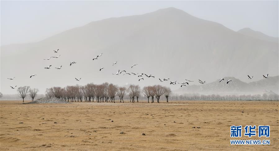 在西藏山南市境内雅鲁藏布江北岸,黑颈鹤在飞翔(3月11日摄)。随着天气转暖,西藏雅鲁藏布江河谷地带的黑颈鹤即将结束越冬,返回藏北。新华社记者 晋美多吉 摄