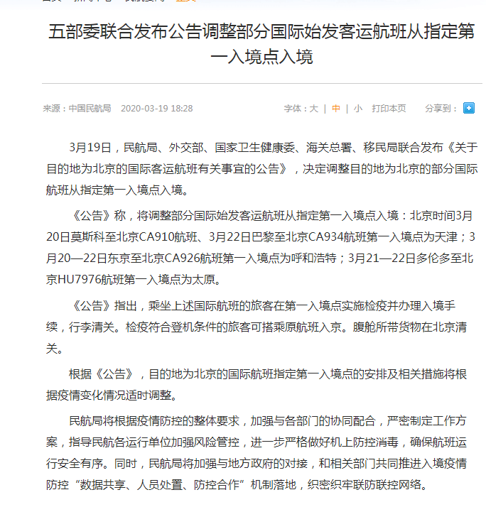 据中国民用航空局网站消息,3月19日,民航局、外交部、国家卫生健康委、海关总署、移民局联合发布《关于目的地为北京的国际客运航班有关事宜的公告》,决定调整目的地为北京的部分国际航班从指定第一入境点入境。 《公告》称,将调整部分国际始发客运航班从指定第一入境点入境:北京时间3月20日莫斯科至北京CA910航班、3月22日巴黎至北京CA934航班第一入境点为天津;3月20—22日东京至北京CA926航班第一入境点为呼和浩特;3月21—22日多伦多至北京HU7976航班第一入境点为太原。 《公告》指出,乘坐上述国际航班的旅客在第一入境点实施检疫并办理入境手续,行李清关。检疫符合登机条件的旅客可搭乘原航班入京。腹舱所带货物在北京清关。 根据《公告》,目的地为北京的国际航班指定第一入境点的安排及相关措施将根据疫情变化情况适时调整。