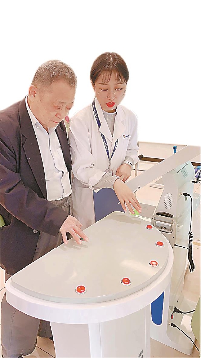 打浦桥街道智慧健康小屋里,工作人员为老人讲解如何进行反应力测试。 摄于2019年10月