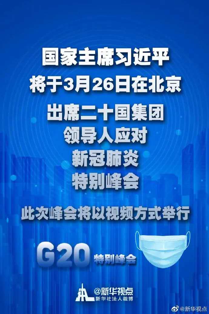 此次峰会由今年二十国集团主席国沙特阿拉伯王国主办,将以视频方式举行。 来源:新华社、新华视点微博 监制:何莉编辑:李昂、陈子夏 |