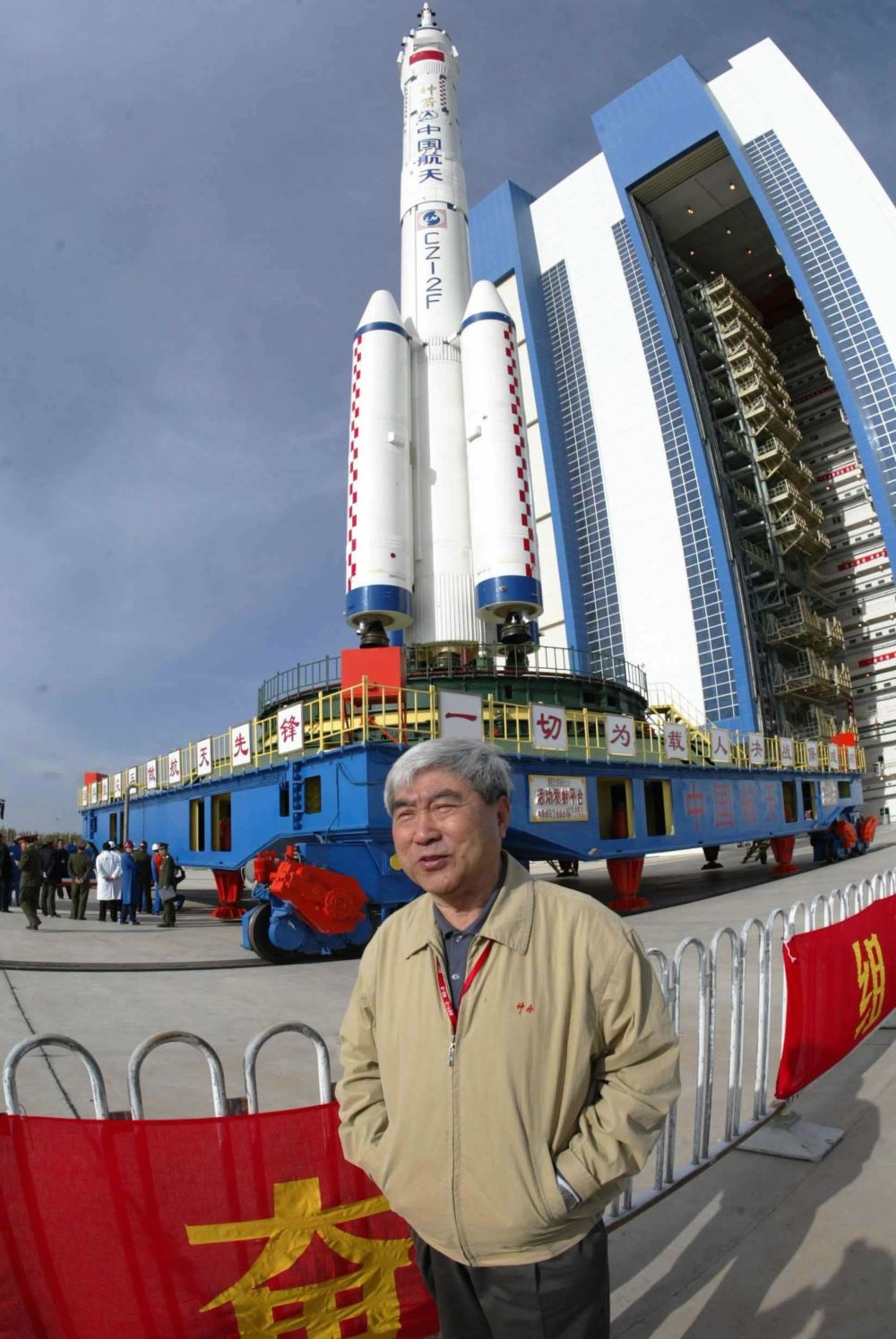 2003年10月16日,酒泉,戚发轫在“神舟”五号载人飞船前留影。新华社记者李刚摄