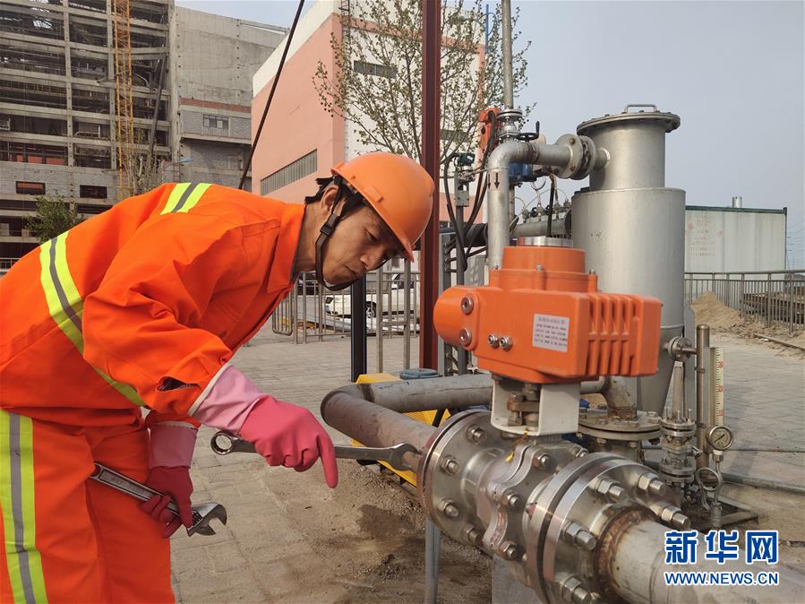 4月14日,全国人大代表、东营市市容环境卫生处创新工作室负责人张金海在东营市生活垃圾焚烧发电厂检查废气燃烧控制装置。新华社发(刘新亭摄)