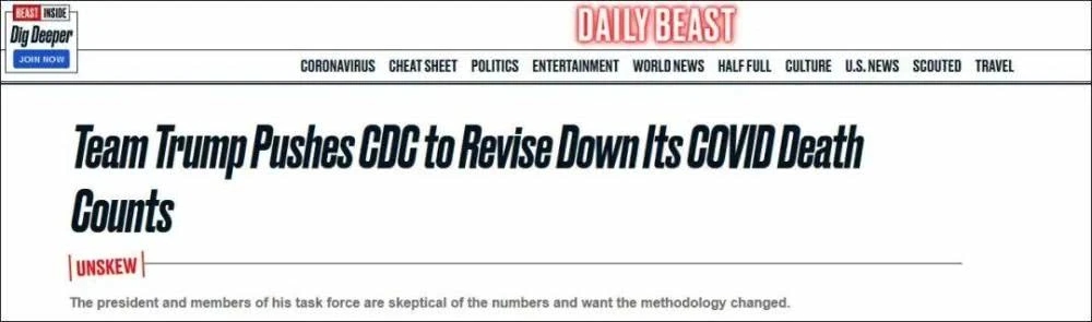 综合美国新闻网站“每日野兽”和“商业内幕”报道,美国疾控中心的消息人士透露,特朗普以及白宫疫情应对小组成员正在施压,要求疾控中心修改新冠肺炎死亡病例的统计方式。 据称,白宫方面认为美国目前的死亡数字过高,因此要求修改后的统计方式能够报告更少的死亡病例。 3位政府方面官员透露,白宫疫情应对小组成员伯克斯表示,未经实验室检测确诊感染、推测阳性以及确诊感染但直接死因不是新冠肺炎的死亡病例应当从统计中被移除。 但是,美国的一些公共卫生专家已经反复强调,该国疫情的真正死亡人数实际上比报道的要高得多。 12日,美国顶级传染病专家福奇通过视频连线参加了参议院的新冠疫情听证会,他坦言,自己认为美国疫情实际死亡人数高于记录数字。 ![]()