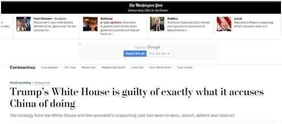 大选临近,特朗普要隐瞒疫情数据的目的显而易见。 白宫经济顾问委员会上周甚至发布一个预测模型,称到5月中旬,新冠死亡人数将降至零。 但是疫情不会撒谎,数据更不会撒谎。特朗普政府的做法只能让世界更加认清美国玩弄的把戏。 《华盛顿邮报》13日刊文指出,白宫和总统支持者的策略一直是否认、歪曲、转嫁和阻挠,正是特朗普的白宫,才恰恰犯下了它指责中国的那些罪行。 ![]()