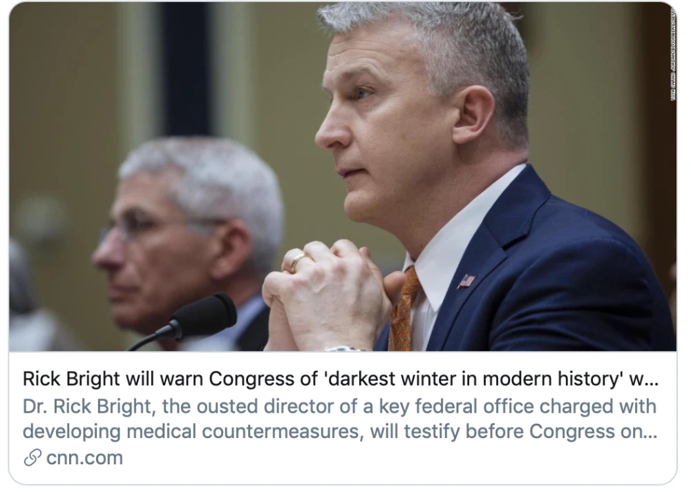布莱特警告国会美国将迎来“现代史上最黑暗的冬天”。/CNN报道截图
