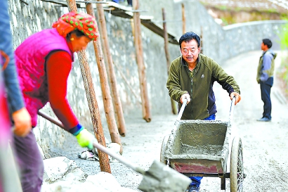 甘肃省甘南藏族自治州舟曲县果耶镇勒阿村驻村第一书记张金利(右)和村民一起修建入村道路的护坡(2020年4月22日摄)。 新华社记者 陈斌 摄