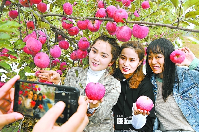 游客在陕西省延安市志丹县双河镇李家湾村果园拍照留影(2019年10月22日摄)。 新华社记者 陶明 摄