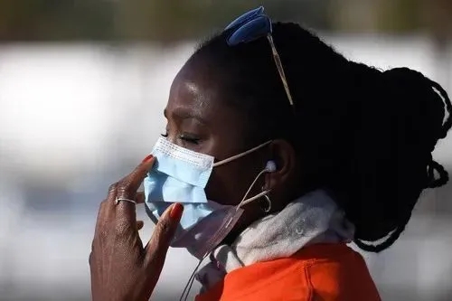 3月27日,在美国洛杉矶海港,在等待海军医院船“仁慈”号到来的人群中,一名非裔女性在调整她的口罩。新华社/法新