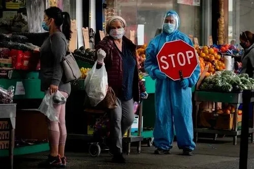 5月18日,在美国纽约皇后区的一家超市,一名身着防护服的工作人员控制顾客人数。新华社/法新