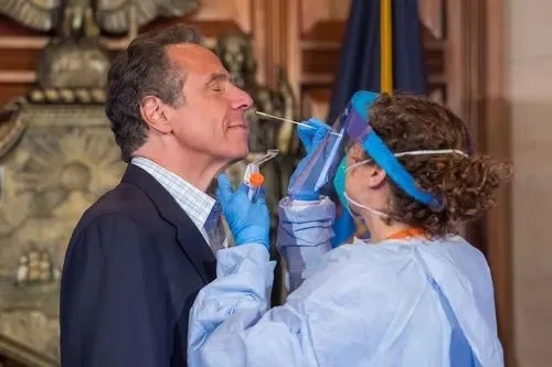 5月17日,在美国纽约州奥尔巴尼举行的新闻发布会上,纽约州州长安德鲁·科莫(左)与医生现场演示新冠检测过程。新华社发(纽约州州长办公室供图 达伦·麦吉摄)