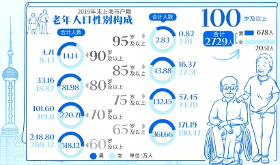 ![]() 无图说 记者从市民政局了解到,参照《上海市老年人口和老龄事业监测统计调查制度》,在本市各有关部门和各区相关单位的配合下,上海市老龄工作委员会办公室和上海市统计局完成2019年上海市老年人口和老龄事业监测统计工作(统计截至2019年12月31日)。 据统计,截至2019年12月31日,全市户籍人口1471.16万人,其中60岁及以上老年人口518.12万人,占总人口的35.2%;80岁及以上高龄老年人口81.98万人,占60岁及以上老年人口的15.8%,占总人口的5.6%。 值得注意的是,100岁及以上老年人口2729人,其中男性678人,女性2051人。从2018年末至2019年末,100岁及以上老年人口增加213人,增长8.5%;每10万人中拥有百岁老人数从17.2人增加到了18.6人。全市各区100岁及以上老年人口列居前三位的依次是浦东新区、黄浦区和徐汇区,分别有百岁老人560人、261人和243人,占全市百岁老人比重分别为20.5%、9.6%和8.9%。 在户籍老年人口性别构成方面,60岁及以上老年人口中,男性占48.0%,女性占52.0%,而在100岁及以上老年人口中,男性仅占24.8%,女性占75.2%。2019年,本市户籍人口预期寿命为83.66岁,其中男性81.27岁,女性86.14岁。老年人口死亡比例最高的前三种疾病分别是循环系统疾病、肿瘤和呼吸系统疾病,分别占老年人口死因的43.6%、29.2%和8.2%。 在养老保障方面,全市60岁及以上老年人领取城镇职工基本养老金的人数共计419.41万人,占老年人口80.9%,平均养老金每月4521元;全市60岁及以上老年人领取城乡居民基本养老金的人数共计49.75万人,占老年人口9.6%。老年福利方面,2019年全年发放老年综合津贴人数为367.2万人,共计发放56.7亿元。