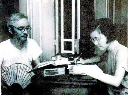丰子恺在上海寓所日月楼与幼女丰一吟合译《源氏物语》。