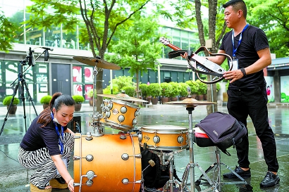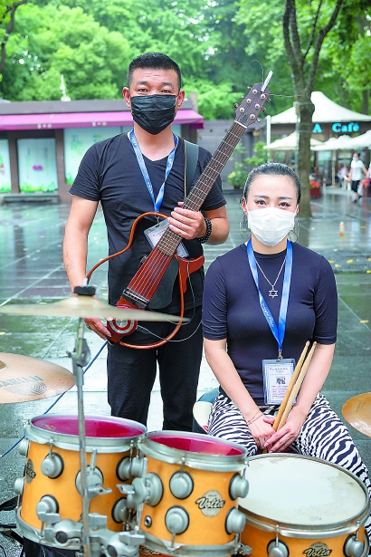 杨勇和董彬组成的风部落乐队在静安公园作演出前的准备。