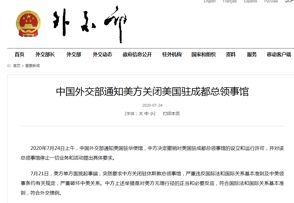 2020年7月24日上午,中国外交部通知美国驻华使馆,中方决定撤销对美国驻成都总领事馆的设立和运行许可,并对该总领事馆停止一切业务和活动提出具体要求。 7月21日,美方单方面挑起事端,突然要求中方关闭驻休斯敦总领事馆,严重违反国际法和国际关系基本准则及中美领事条约有关规定,严重破坏中美关系。中方上述举措是对美方无理行径的正当和必要反应,符合国际法和国际关系基本准则,符合外交惯例。