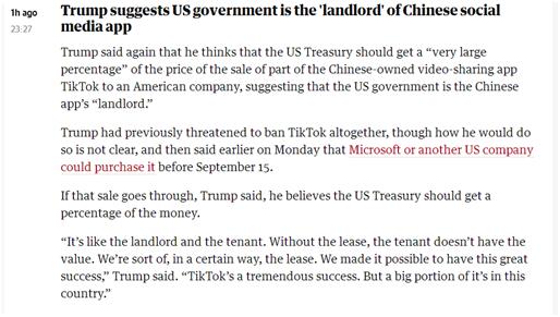 【环球网报道 记者 张晓雅】“这就像房东和房客。我们不出租(地方),房客就不会有价值。是我们让这一巨大成功成为可能。”美国总统特朗普在3日白宫记者会上不仅赤裸裸恐吓TikTok必须在9月15日前卖给美国,甚至还为这番强买强卖找了个借口。 英国《卫报》消息称,特朗普在记者会上表示,他认为,无论是微软还是其他公司,在完成与TikTok的交易后,相当大一部分钱必须交给美国财政部,并暗示美国政府是这款中国应用平台的“房东”。 ![]() 《卫报》报道:特朗普暗示美国政府是中国社交媒体应用程序的“房东” 在威胁“封禁TikTok”后,特朗普2日曾表示,微软或其他美国公司须在9月15日前收购TikTok。3日的新闻发布会上,特朗普赤裸裸恐吓说,TikTok必须要在9月15日之前卖给美国,否则必须关门,而且相当一部分交易的钱要交给美国财政部。 ![]() “这就像房东和房客。我们不出租(地方),房客就不会有价值。在某种程度上,我们就是租赁关系。是我们让这一巨大成功成为可能。”特朗普说,“TikTok取得了巨大的成功,但很大一部分(成功)是在这个国家(取得的)。” 特朗普还说,美国政府应该从这笔交易中获得资金:“不管这个数字是多少,它都将来自这笔交易。” “除了我,没有人会想到这个,”他还补充,“但这就是我的想法,这很公平。” 连日来,美国政府联合商业巨头恐吓并强买TikTok引发国际关注。德国新闻电视台3日指出,TikTok事件是美国经济强权的又一象征。德国、法国等许多欧洲国家的企业也曾遭到美国的各种调查。俄罗斯媒体和学者建议俄效仿美国“经验”,封禁在俄运营的美国社交媒体。中国外交部发言人汪文斌3日表示,美方泛化国家安全概念,在拿不出任何证据的情况下对有关企业作“有罪推定”并发出威胁,这违背市场经济原则,暴露了美方所谓维护公平、自由的虚伪性和典型的双重标准,也违反了世贸组织开放、透明、非歧视原则,中方对此坚决反对。 责任编辑:日升 (责任编辑:日升) |