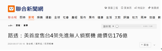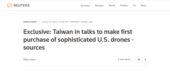 根据报道,两名知情人士还表示,这项军售必须获美国国会议员的批准,他们可能最快下个月就会收到正式通知。路透社称国会可以选择阻止一项最终协议。 一名消息人士提到,台湾于今年初提出采购武装无人机要求,美方上周向台湾发出了有关这项交易的报价与可用性数据等资料。路透社虽提到这是一个关键步骤,意味着美国官方批准推进该交易,但称这并不具备约束力,并且是可以逆转的。 联合新闻网6日称,若以先前交易案当作参考,4架无人机,加上地面站、备件、训练和支持费用,整笔交易总价值将达到约6亿美元(约合新台币176亿元,约合41.7亿元人民币)。 路透社认为,北京与华盛顿的关系目前由于新冠病毒、香港问题等多重因素已经处于几十年来的最低点,这笔交易可能会加剧中美关系紧张。 据报道,台当局“驻美国台北经济文化代表处”目前尚未回应路透社记者有关置评请求。美国国务院发言人对该交易的回应则是,“根据政策,我们不会对拟议中的国防销售或转让(案)进行评论或确认,直到正式通知国会。” 虽然这笔交易目前还没有取得实质进展的消息,但路透社这则独家报道发布后,迅速引发“中央社”、联合新闻网、亲绿媒体《自由时报》等台湾媒体关注。 ![]() “中央社”援引路透社称,美国一直热衷于出售战车和战机给台湾,但出售这批先进无人机势必会引人瞩目,因为只有包括英国、意大利、澳大利亚、日本和韩国等少数亲密盟友,获准采购这种最大型美制无人机。《自由时报》更是自嗨称,“无人机只卖美国亲密盟友”。目前“海上卫士”是能够挂载武器的,前提是美国政府于合约中准许。 ![]()