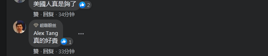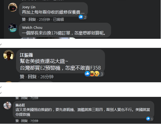 在社交媒体脸书上,许多台湾网友谈论此事。有网友质疑这又是美国在“收保护费”,“真的好贵”,“吓吓你,然后跟你收保护费”,蔡英文当局“真的太会乱花钱了”,“(无人机)所谓先进,是否过时?” ![]() ![]()
