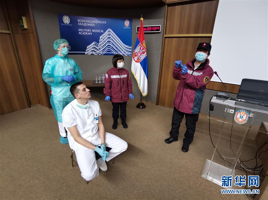 3月28日,中国赴塞尔维亚抗疫医疗专家组在贝尔格莱德对医护人员进行培训时讲解标本采集。 新华社发(专家组供图)