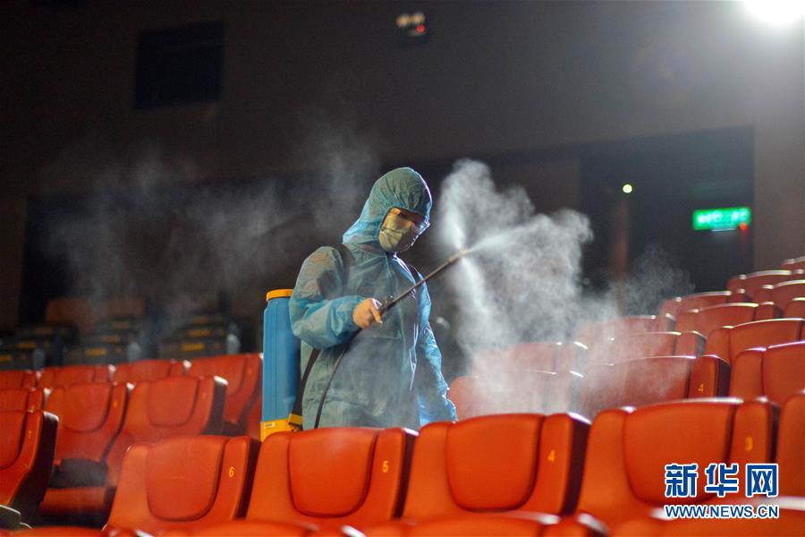 6月26日,马来西亚吉隆坡一家电影院的工作人员为放映厅消毒。马来西亚政府允许电影院等场所于7月1日起恢复营业。新华社发(张纹综摄)