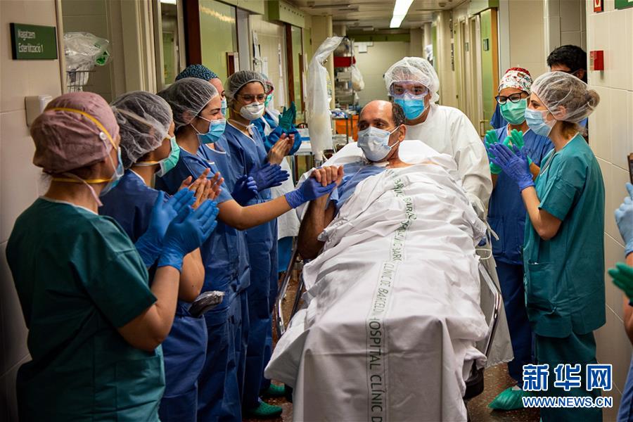 5月7日,在西班牙巴塞罗那的一家医院,一名新冠患者在离开重症监护室前和医护人员握手致意。 新华社发(弗朗西斯科·阿维亚摄)