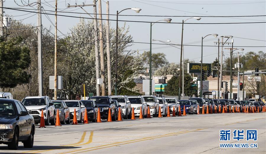 5月6日,在美国伊利诺伊州芝加哥西北部一处新冠病毒检测点,人们驾车排起长队等待检测。 新华社发(乔尔·莱纳摄)