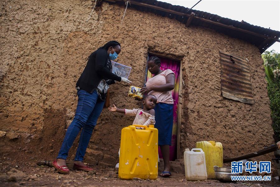 3月28日,在卢旺达首都基加利,一名政府官员(左)将救助物资交给受新冠肺炎管控措施影响的贫困家庭。 新华社发(西里尔·恩德格亚摄)