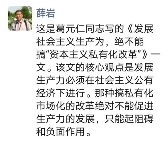 ![]() 葛元仁,北京老知青,现为中国社会科学院世界社会主义研究中心特邀研究员,近日在昆仑策网、昆仑策研究院公众号发表文章《发展社会主义生产力,绝不能搞“资本主义化的改革”》。文章发表后,引起众多留言热评。现将部分评论及葛元仁的文章同时发布,以飨读者。 热评: 在左翼队伍中,很多同志、尤其是一些老同志是非常理性的,他们能够实事求是地看待社会现象,用科学的马克思主义理论去分析问题,并能给出积极的建议。但是他们的倡议得不到回应,甚至遭到攻击。您就是这样一位老同志。 在当下的社会环境中,坚持马克思列宁主义,坚持科学的理论和观点,都被人重视和采纳,因为这些主张侵害了既得利益集团的利益。(思考) 葛元仁的这篇文章,坚持以中国共产党的理想信念和全心全意为人民服务为宗旨,坚持社会主义以公有制为主体的根本制度,坚持走人民劳动大众共同富裕之路,文章以毛泽东思想、新时代思想为指导,用详实的史料和建国70年的社会实践,从理论和实践上证明文章所列观点,是一篇有说服力的好文章,是葛元仁近年撰写发表的最好文章之一。此文应提交中央有关部门参阅,以期改进改革现有不合理、不完善、不适宜的体制和制度。(宋爱国) 我认为葛元仁文章有些道理。设想,如果医院都私有化了,今年怎么抗疫?曾经为国家干活的广大工人现在变成都给私人老板打工,没有了主人翁的地位和待遇,国家还有多少社会主义性质?改革的目的是什么?不是两级分化吧? 方舱医院让患者有幸福感,是因为免费医疗,患者享受平等的有尊严的医疗。如果有人住两千元一天的豪华病房,有人住不起一百元一天的,哪里来的幸福感? 现在感到有些地方农村集体经济被削弱了,以往的兴修水利防洪抗旱设施,在今年的特大水灾面前显得薄弱。(晓歌) 是的!葛大哥,下午我又看了看您的文章,一开始就把马克思的生产力和生产关系讲明白了,虽然我还是理解的不透彻,但我觉得您的观点非常旗帜鲜明!确实您对马列毛及习的理论理解的深刻,并应用在社会各个阶层和领域,一般沒有理论水平的人,是根本看不懂的,只知皮毛,我觉得我本人就是!但有一点,知道您的观点是为国为民,忧国忧民有正义感!现在社会上能有几人像您看得这么透,用理论和事实阐述一切,我们国家再不扭转向钱发展的势态,两极分化这么严重,总有一天会走向危险的边缘!毛泽东时代革命的老一辈真正的共产党人,用鲜血和生命换来的红色江山如何不变颜色!不敢想像。葛大哥,我真的不好意思和您说,但我又真的想从您这学点知识!(香莲) 此文很好,基本上是理论联系实际讲明了如何是社会主义,社会主义为谁服务的问题。现在社会为何腐败还这么严重,医疗,教育等还存在不少问题,两级分化现象也没有改观,究其原因先富论仍在起作用,从各方面看还是没走出为了部分人的怪圈。社会主义成份少,资本主义的成份甚多?社会主义成份不能光从大活动,大灾大难中体现集体的力量,更重要要从各方面各环节,体现社会主义的优势?!(周家生) @葛元仁 老师:您的这篇文章写得犀利,大胆。讲出百姓也想说的话。(满园芳香) 恕我直言,全民逐利时代你的文章只有在学术期刊进行讨论方能显示其价值,底层百姓不关心也看不懂,他们朴素地、虔诚地相信中央及智库应对种种社会问题的政策和策略,其他专家或学者偶尔尖锐的批评和呼吁几无百姓会入心。故而只能作为一种声音存在于世间,绝不会产生任何影响。你水平很高的,但曲高和寡,道理于此。 能深入思考或者有能力思考社会问题者,在我所接触的群体里,惟有老葛你了!(谢谢你的抬举。不敢当啊!)不是抬举是实话,我早就说过以你的理论水平和分析问题能力,学了工科确是大材小用了!当然在工学领域你的才华为我们的社会经济发展同样做出了突出的贡献。(郝传玉) 葛老,您这篇文章写得太犀利了!酣畅淋漓,深度揭露,难怪他们要大骂这是反对改革,是真从根源上揭下他们的遮羞布了!他们急了,恼羞成怒!(未名之素) 葛老,您这篇文章写得太犀利了!酣畅淋漓,深度揭露,难怪他们要大骂这是反对改革,是真从根源上揭下他们的遮羞布了!他们急了,恼羞成怒!葛元仁老师的文章《发展社会主义社会生产力,绝不能搞“资本主义化的改革”》是篇极好文章,但愿能引起决策者重视。(张应宝) 《发展社会主义社会生产力,绝不能搞“资本主义化的改革”》文章所阐述的“道理”是洞察和辨别改革开放历程、改革开放本质属性的一把“金钥匙”!!比如:“改革开放”的理论本质是“唯生产力”、“实用主义”还是“辩证唯物主义”?是“新民主主义”+“补课论”还是“社会主义”?还比如:是伪“科学技术”是第一生产力还是“人是第一生产力”?...... 《生产力》那篇写的好!!水平很高,无可辩驳!!(党生) 我非常赞成文中的论点。说服力很强,引经据典,历史和现实结合说明了当今社会应该走什么路,中国才能真正强大,人民才能真正挺起胸来做人!这是我肤浅的体会。我还要多看几遍,加深理解。感谢葛老师辛苦,为国为民探索研究复兴之正确道路,指明方向!这文章我感觉要多发送,提高全民的认识,中国才有希望,才有方向。这些年来中国让私有制闹腾的人都有些不认真关心国家前途了,应该猛醒了!(孙志明) 葛老、你的文章《关于发展社会主义社会生产力……》我看了,很好!
