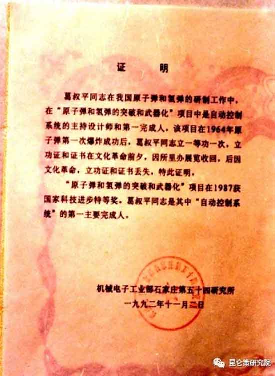 父亲在第一次核试验中荣立一等功,又获得两个“国家科技进步特等奖”,这在科技界是少有的。直到父亲去世,我们才从父亲所属研究所的悼词中知道,父亲一生先后参加了一百多项重大尖端军事工程的研制工作,获得了26项科研成果,填补了不少军事科研的空白。荣立一等功一次、二等功四次、三等功一次,总部通令嘉奖一次。 “两弹一星”元勋和工程院院士中有的人就是父亲的同事,我们家的邻居,他们都没有我父亲完成的任务多而且重要,只因为他们有国外留学的经历。直到屠呦呦因为没有国外留学经历,几次没有评上院士,我才明白个中的原因。毛泽东时代在能力和学历上更加重视能力,如同战争年代,不管你是什么学历,能够打胜仗的干部才能受到重用。作为工人出身,党培养的高级知识分子,父亲到是很不在意,他认为那些都是虚名,自己实实在在地为国家的强大做出了贡献就行了。还告诫我们,要多做实事,少图虚名。毛主席说过“科学家是老实人”。 父亲一生忠于党,忠于毛主席,在科研工作中严谨,认真,一丝不苟,处处为国家着想,不图名利的思想作风,永远是我们的榜样,他永远活在我们心中! 2020.8.25 修改稿 (作者系“两弹一星”元勋之一葛叔平之子;来源:昆仑策网【原创】) 责任编辑:宋爱国 (责任编辑:铁滨) |
