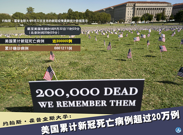 海报:约翰斯·霍普金斯大学:美国累计新冠死亡病例超过20万例 新华社记者 刘茜 编制