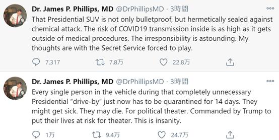 当地时间4日,正入院接受治疗的美国总统特朗普乘坐专车短暂离开沃尔特·里德医疗中心,在车内向医院外的支持者挥手致意,此举引发外界关注,也招致一些批评。其中,沃尔特·里德医疗中心的医生詹姆斯·菲利普斯就斥责特朗普“不负责任的程度令人震惊”。他表示,该行为可能会危及到陪同特朗普乘车的特勤组成员的生命。 ![]() 据美国有线电视新闻网(CNN)4日报道,菲利普斯当天在推特上发文,对特朗普乘车外出并被拍下照片一事进行了猛烈抨击。他写道:“在刚才那个完全没有必要进行的总统‘乘车’的活动中,车内的每一个人都需要被隔离14天。他们可能会生病。他们可能会死。这都是因为这部‘政治剧目’。这是在特朗普的指挥下冒着生命危险上演的戏剧。这种行为简直是疯了。” “那辆总统SUV不仅能防弹,而且为了不受生化袭击,是完全密封的。但新冠病毒在医疗措施内部传播的风险,与它在其外部传播的风险是一样高的。这种不负责任的程度令人震惊。我觉得特勤局是在被迫出场。” 菲利普斯继续写道。 ![]()