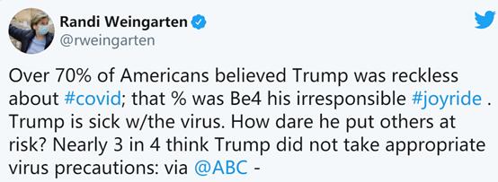 不仅是菲利普斯,特朗普乘车短暂出行的行为也引起很多人批评。据“今日俄罗斯”(RT)报道,白宫记者协会对此“抱怨”说,特朗普离开医院时,现场没有采取防护措施的白宫记者在场,这样就不能确保美国人知道总统在哪里以及他做了什么,而这是“令人无法接受的” 。 美国教师联合会主席、美国劳工领袖兰迪·温加顿也斥责特朗普的乘车行为是“不负责任的”。她在推特上写道:“特朗普自己感染了病毒,他怎么敢也把别人置于危险之中?有美媒报道,近3/4的美国人认为特朗普没有采取适当的防疫措施。”↓ ![]() 一位名为“BeSeriousUSA”的推特用户也批评称,特朗普让车上所有人“陷入危险之中”,只为了让他的支持者们注意到他。↓ ![]() 对于特朗普乘车外出一事,也有记者质疑称,特朗普此举可能会将身边人置于危险之中。对此,白宫发言人贾德·迪尔(Judd Deere)当天则回应说,车辆及相关人员已采取了“适当的预防措施”,以保护总统及其所有支持者。特朗普的竞选顾问贾森·米勒在CNN的节目中也表示,特朗普“以一种安全的方式乘车打招呼”。 特朗普于美国东部时间2日傍晚被送往位于马里兰州的沃尔特·里德国家军事医疗中心接受治疗。当天凌晨,特朗普证实他与夫人梅拉尼娅感染新冠病毒。白宫副新闻秘书贾德·迪尔称,在特朗普4日短暂出行后,现已返回沃尔特·里德的总统办公室中。 责任编辑:日升 (责任编辑:日升) |