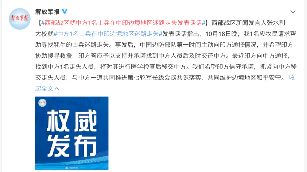 西部战区就中方1名士兵在中印边境地区迷路走失发表谈话 西部战区新闻发言人张水利大校就中方1名士兵在中印边境地区迷路走失发表谈话指出,10月18日晚,我1名应牧民请求帮助寻找牦牛的士兵迷路走失。事发后,中国边防部队第一时间主动向印方通报情况,并希望印方协助搜寻救援,印方答应予以支持并承诺找到中方人员后及时交还中方。最近印方向中方通报,找到中方1名走失人员,将对其进行医学检查后移交中方。我们希望印方信守承诺,抓紧向中方移交走失人员,与中方一道共同推进第七轮军长级会谈共识落实,共同维护边境地区和平安宁。