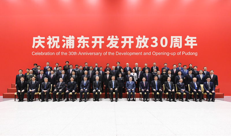 11月12日,浦东开发开放30周年庆祝大会在上海市举行。中共中央总书记、国家主席、中央军委主席习近平在会上发表重要讲话。这是习近平等亲切会见参加庆祝大会的部分代表并同大家合影留念。新华社记者 申宏 摄