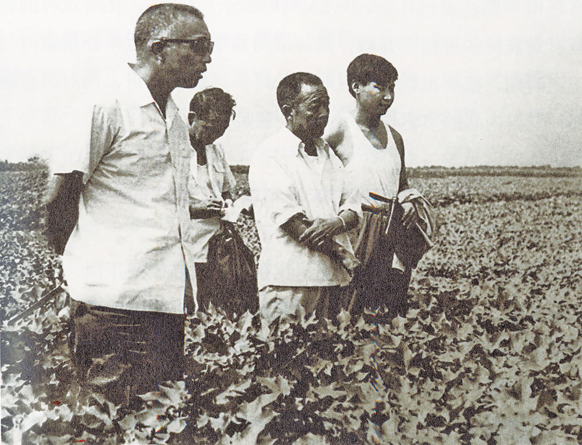 1983年8月,习近平(右一)到田间考察棉花生产。