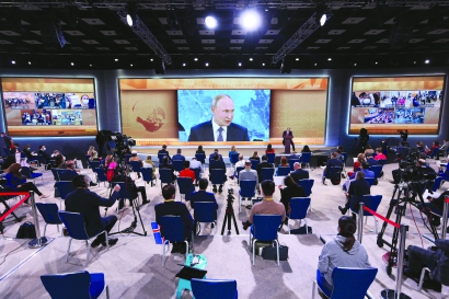 12月17日,在莫斯科,普京年度记者会以视频方式举行。 新华社发