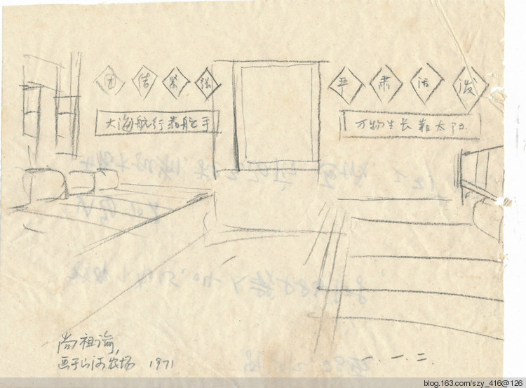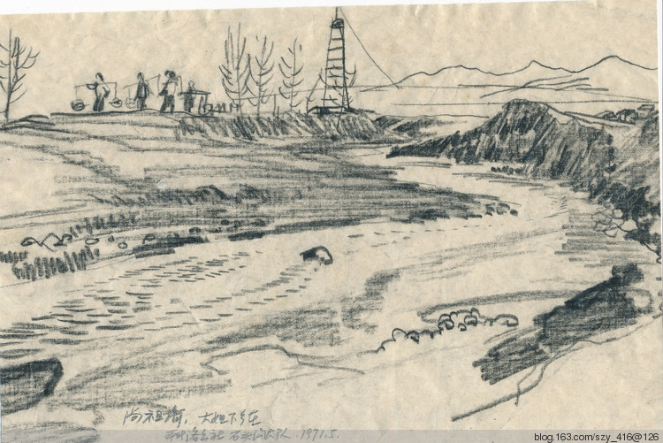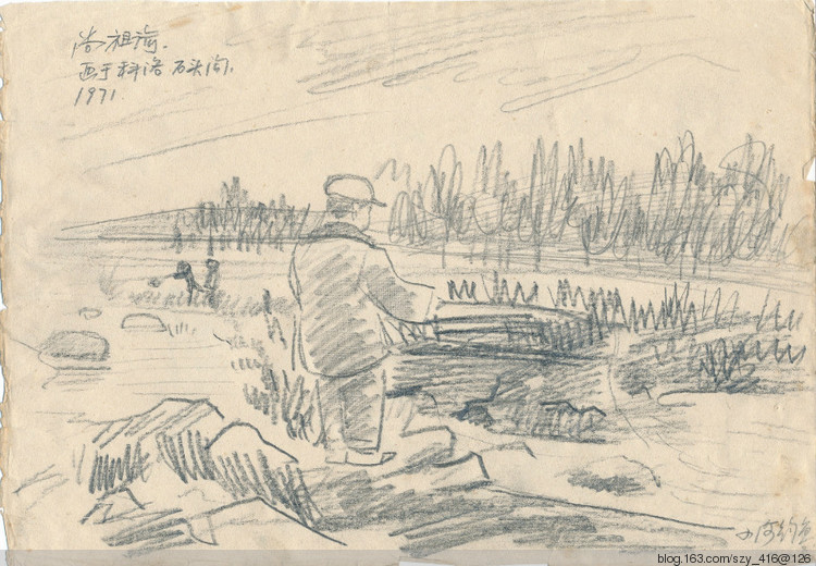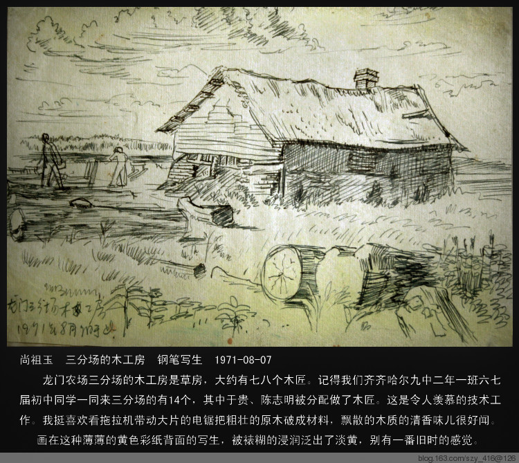 1971 年,我先被借后被调到总场政工组工作,参加筹办黑河地区和北安农场局的知青展览,参加对良种站的“二劳改”的管理工作,还试制过肥皂。之后就是办农场的《龙门战报》,画画,写标语等等。大家种地,我舞文弄墨,算是白领了。多次去龙镇、北安、哈尔滨和一些农场,眼界大开了。下面的写生中有我去山河农场参观采风时就近去嫩江县科洛公社看望我的姐姐尚慧操,她是 1965 年初中毕业就下乡的。