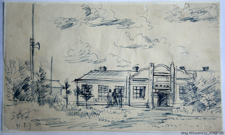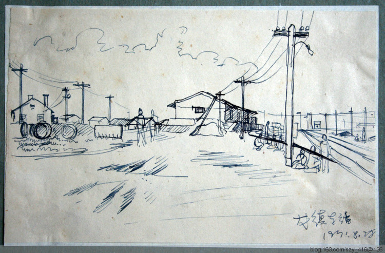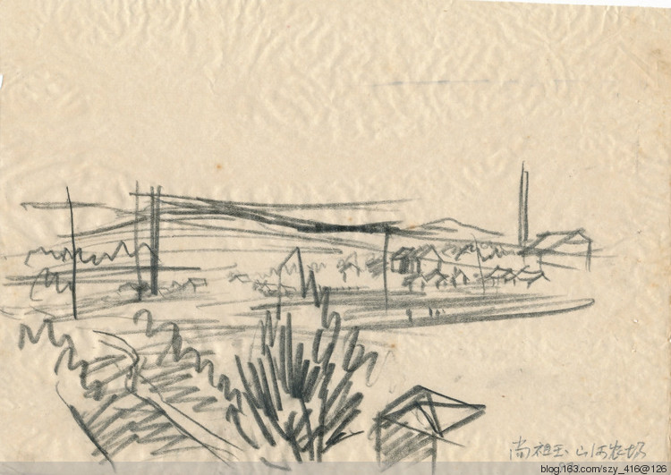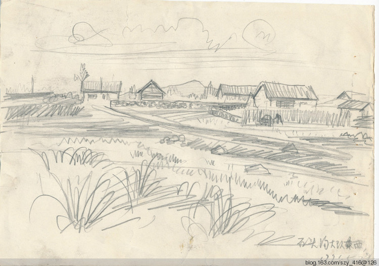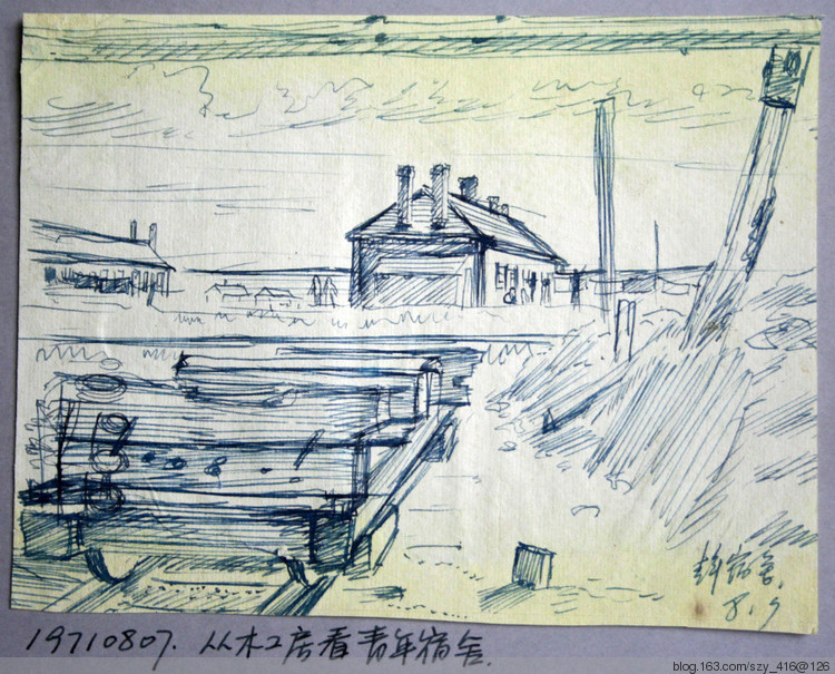 1971 龙门农场 钢笔速写 三分场 从木工房看女宿舍