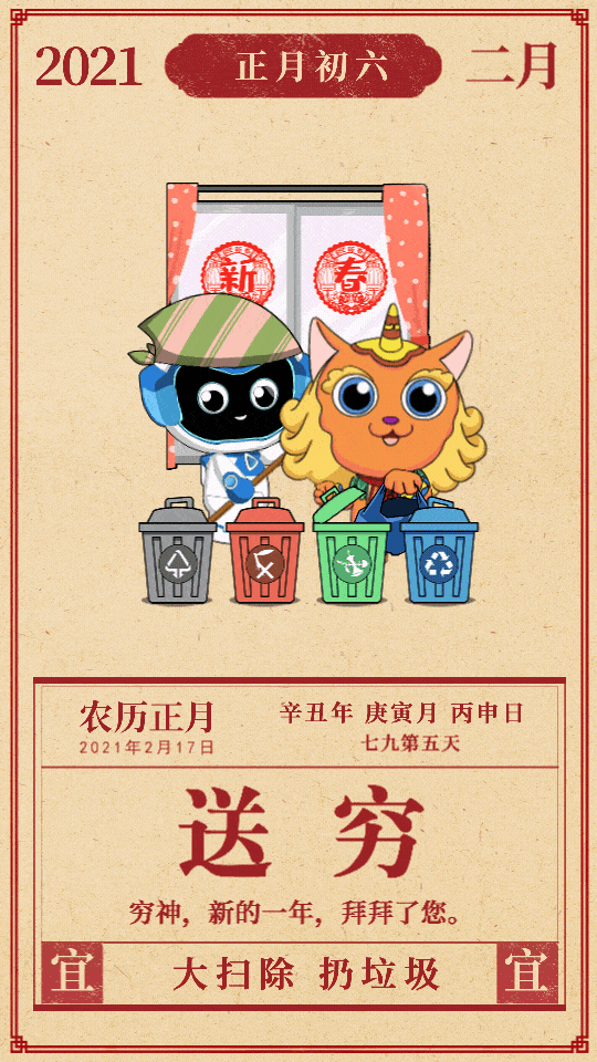 ![]() “正月初六,送穷神”。 大年初六,要把正月初五之前的垃圾清除出门,谓之“送穷”。 清晨即起,洒扫庭除,新年图个好彩头、一年都有精气神儿。 扔垃圾时也要注意分类哦! 策划:刘娟 监制:唐心怡 统筹:王云霞 文案:刘家欣 插画:刘海东 动画效果:姚远 编辑:马宇聪 设计:李权 校对:郭建伟 ![]() 责任编辑:日升 (责任编辑:日升) |