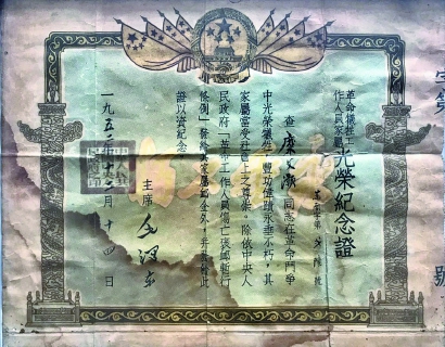 ![]() 毛泽东主席签发的《光荣纪念证》 ![]()