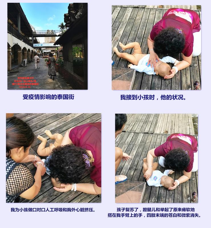 急救大约半分钟后,小孩复苏了,他“哇”地一大声哭出来,还脚蹬手打,但几秒钟后就出现抽搐。我判断这是脑外伤颅内出血的压迫症状,应该在立即施以镇静术中等待120到来。于是,我指导人们交替按压小孩的人中穴和合谷穴以增强镇静。而孩子爸爸的电话的那头,却回话说“120没有车”。孩子爸爸呆若木鸡地盯着孩子,我叫他自己快去准备车,又叫孩子妈妈找来比较硬的小平板将孩子平躺在上面,千叮万嘱她要平端着小孩坐车,而且特别要保护好孩子的头、颈和脊柱,万万不能错位!
