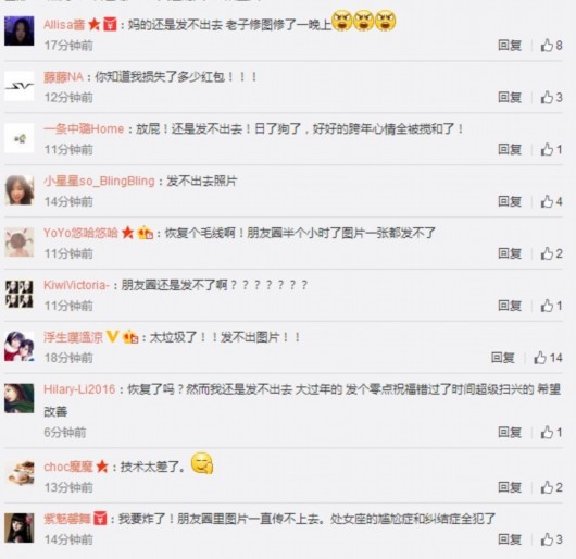 跨年夜,众多网友发现无法正常在微信朋友圈发布红包、图片。腾讯微信团队1日凌晨0:30左右发布微博:由于跨年夜消息发送量急剧增加,后台服务出现短暂不稳定,导致极少数用户在约20分钟内收发消息有延迟。现在已经完全恢复,所有延迟消息均已下发。给大家带来的不便,非常抱歉,祝大家新年快乐! 但依然有众多网友在留言中反映红包和图片都无法发布: