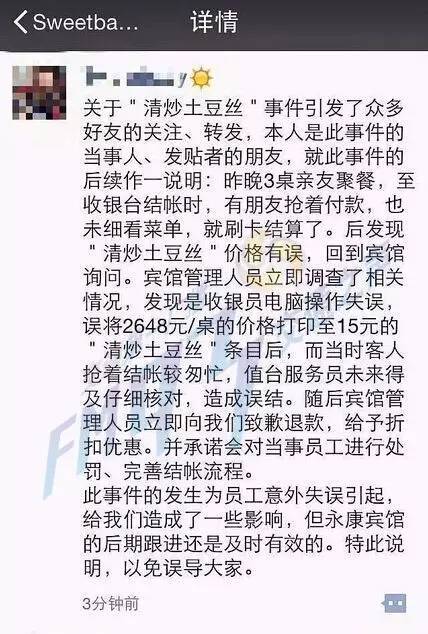 当事人朋友圈做出回应 宾馆方怎么说? 记者找到永康宾馆的负责人赵某,赵某表示,确实是收银员操作失误,并表示已经向客户道歉了。 “那么如果客户没发现,你们会退钱吗?”记者问。 “会啊,我们都有审计的,而且这个客户是我们的老客户,都熟悉的,发现后肯定会退钱给他的,事后,我们也对当班服务员进行了一定的处罚。” (责任编辑:北风) |