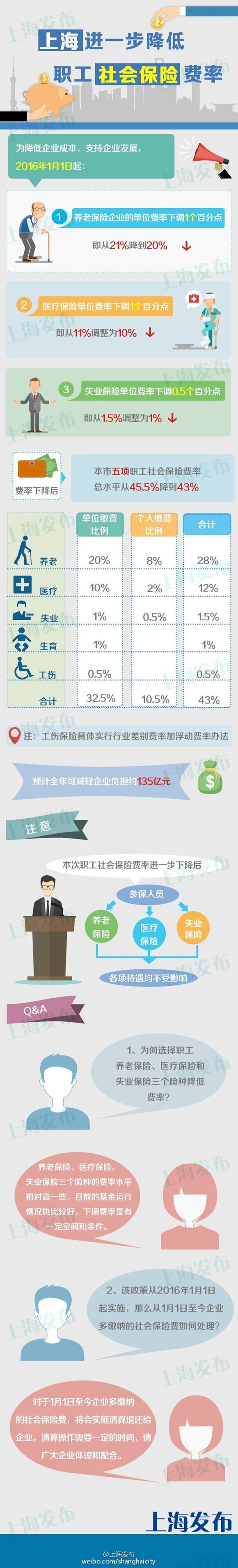 图片说明:副市长时光辉介绍上海完善社会保障制度等相关情况。 东方网记者单冉、徐程3月21日报道:记者今天从市政府获悉,上海进一步降低本市部分职工社会保险的费率水平。该政策从今年1月1日起实施。此次调整共涉及养老、医疗和失业保险三个险种,总体费率下降2.5个百分点。其中,职工基本养老保险费率企业的单位缴费部分下调1个百分点;职工基本医疗保险费率单位缴费部分下调1个百分点;失业保险费率单位缴费部分下调0.5个百分点。今年1月1日至政策公布前企业按照原费率已缴纳的社会保险费实施清算。 本次上海不调整个人缴费部分的费率。国家规定,职工基本养老保险和医疗保险的个人缴费费率分别为8%和2%。上海执行了国家的规定,在个人缴费费率上已经没有进一步调整的空间。此外,职工基本养老保险和医疗保险的个人缴费部分要计入个人账户,直接影响参保人员的社会保险待遇。为此,这次不调整个人缴费部分的费率。 ![]() |