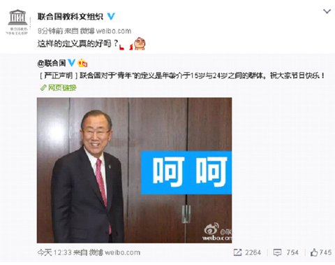 ![]() 今日是中国的五四青年节。中午十二时,“@联合国”在新浪注册的官方微博发表“严正声明”:“联合国对于“青年”的定义是年龄介于15岁与24岁之间的群体。祝大家节日快乐!”随后,“@联合国教科文组织”迅速转发此微博,并评论说:“这样的定义真的好吗?” 2015年起,网上就流传的一则消息称“总部设于瑞士日内瓦的联合国世界卫生组织(WHO),经过对全球人体素质和平均寿命进行测定,对年龄划分标准作出了新的规定,18岁至65岁为青年人。”但联合国官微的“严正声明”并未直接指明是回应这一传言。 该微博迅速引起网友围观并引发大讨论:谁还有资格过青年节?青年节半天假谁能享受?
