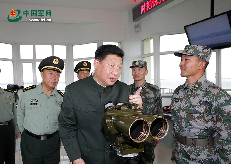 中共中央总书记、国家主席、中央军委主席习近平5月24日、25日亲切看望慰问驻黑龙江部队,代表党中央和中央军委向广大官兵致以诚挚的问候。这是习近平登上驻黑瞎子岛边防某团10连东极哨所,了解官兵执勤情况。