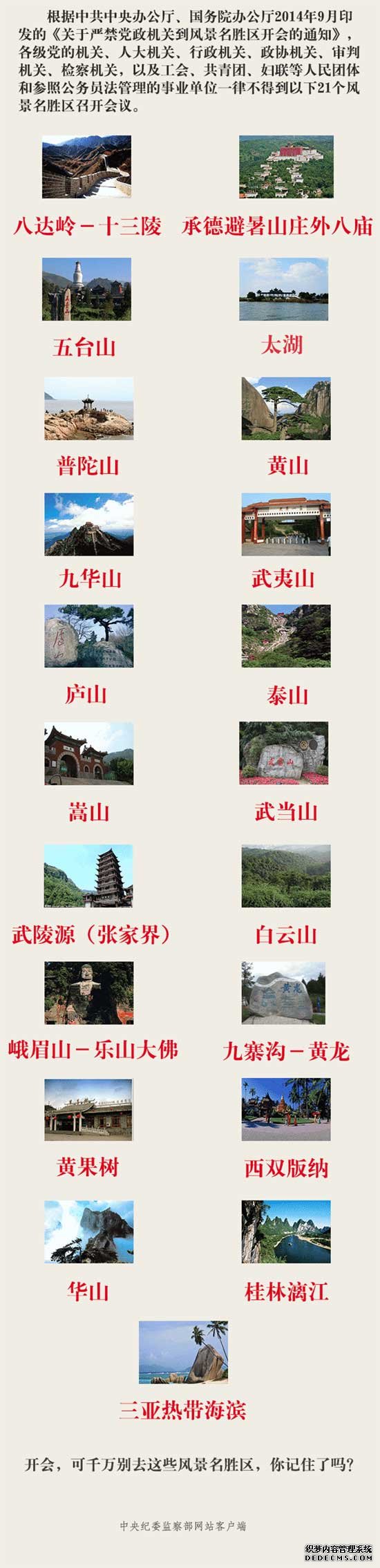 中央纪委监察部网站昨日刊发图文《这些地方风景虽好,开会可别去!》,提醒各级党的机关、人大机关、行政机关、政协机关、审判机关、检察机关,以及工会、共青团、妇联等人民团体和参照公务员法管理的事业单位一律不得到以下21个风景名胜区召开会议。